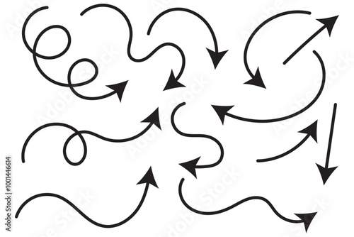 The watermark will not be included on Canvas Print.: Hand drawn thin line arrows set - many vector curvy and wavy arrows isolated on white background -