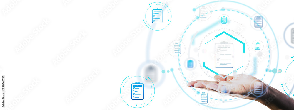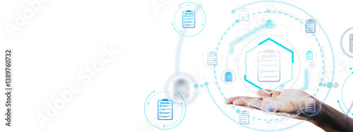 The watermark will not be included on Canvas Print.: Hand holding digital checklist icons with circular interface overlays, light graphic style on white