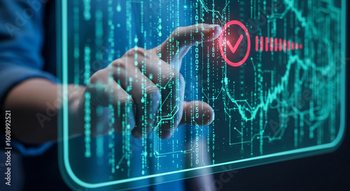The watermark will not be included on Canvas Print.: Hand interacting with a digital interface, showcasing a glowing green verification checkmark, symbol