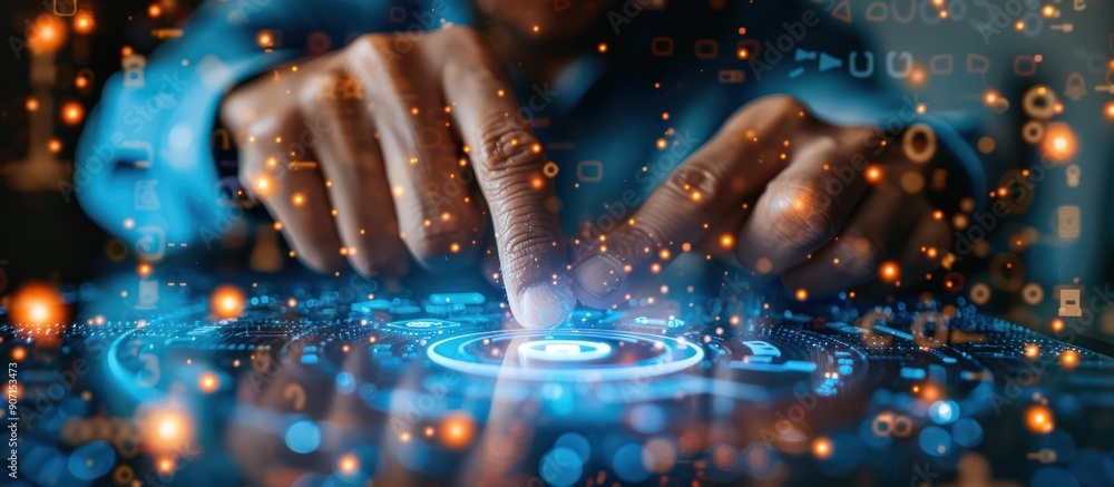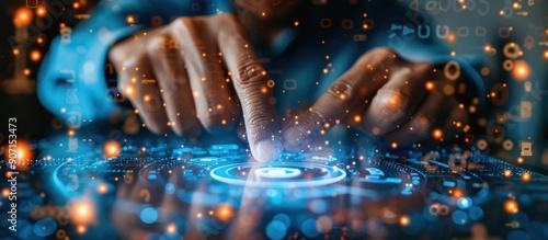 The watermark will not be included on Canvas Print.: Hands interacting with futuristic interface