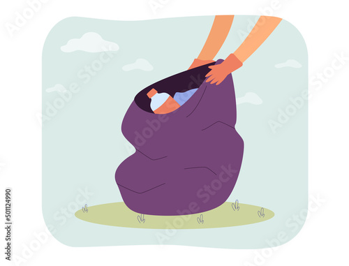 Canvas Print : Hands of volunteer in gloves holding open bag with garbage - person collecting plastic bottles flat v