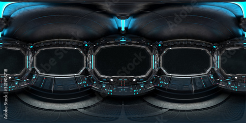 The watermark will not be included on Canvas Print.: High resolution hdri panoramic view of dark spaceship interior - 360 panorama reflection mapping of a