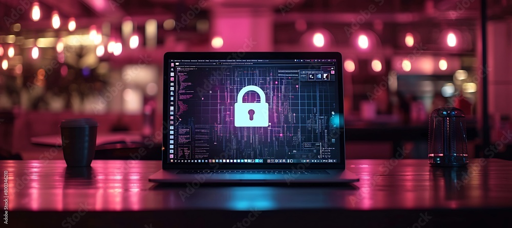 The watermark will not be included on Canvas Print.: High-resolution ultrawide banner featuring a laptop displaying multiple application icons