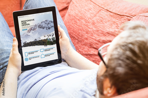 The watermark will not be included on Canvas Print.: Hipster browsing responsive website