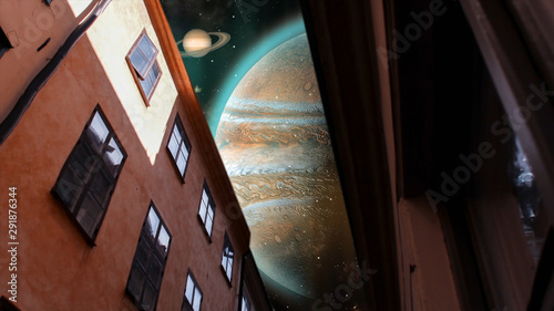 Canvas Prints house, building with cosmos view. jupiter, saturn and uranus. surrealistic 3d rendering. solar syste - Canvas Prints Canvas Prints house, building with cosmos view. jupiter, saturn and uranus. surrealistic 3d rendering. solar syste - Canvas Prints