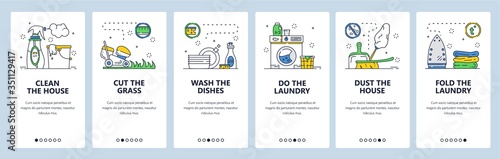 The watermark will not be included on Canvas Print.: House cleaning website and mobile app onboarding screens vector template