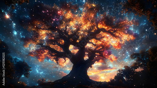 The watermark will not be included on Canvas Print.: Huge trees of life blend with psychedelic colored galaxies with stars, galaxy clouds 3d generative a