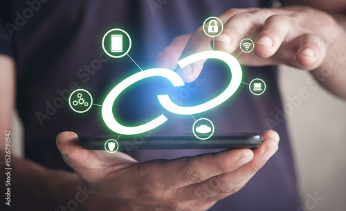 The watermark will not be included on Canvas Print.: Human with a web link and icons - internet - technology