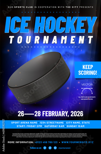The watermark will not be included on Canvas Print.: Ice hockey tournament poster template with puck and sample text in separate layer - vector illustrat