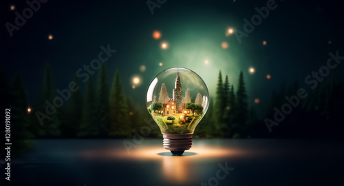 Canvas Prints illuminated lightbulb encases a miniature forest scene with warm lights, set against a dark forest a - Canvas Prints Canvas Prints illuminated lightbulb encases a miniature forest scene with warm lights, set against a dark forest a - Canvas Prints
