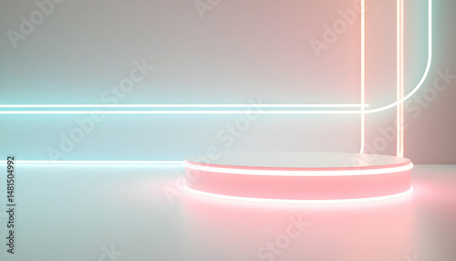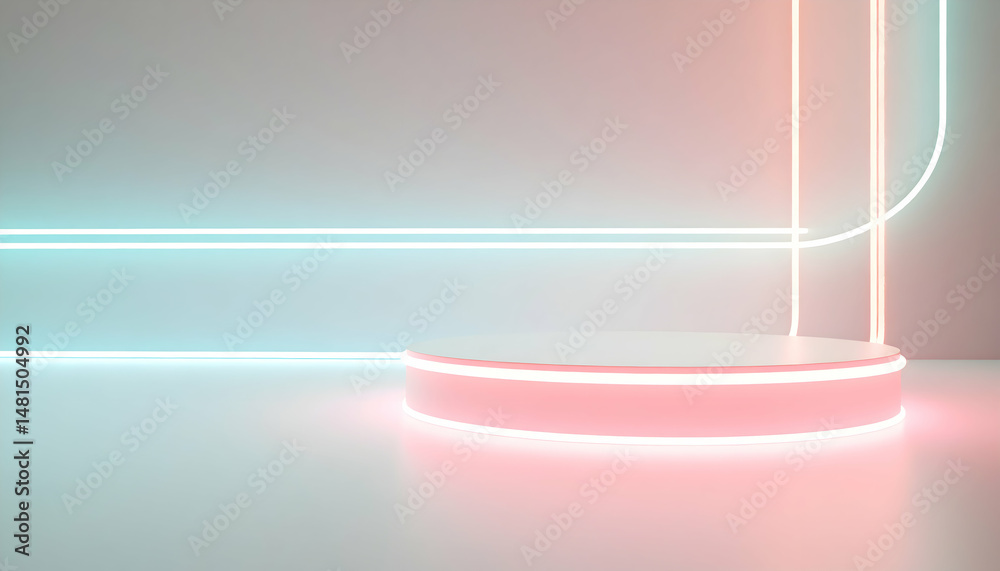 The watermark will not be included on Canvas Print.: Illuminated round platform with neon lights in clean abstract background for product display and mod