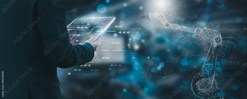 The watermark will not be included on Canvas Print.: Industry engineer in factory,using smart tablet glass device,control automated robot arm machine lea