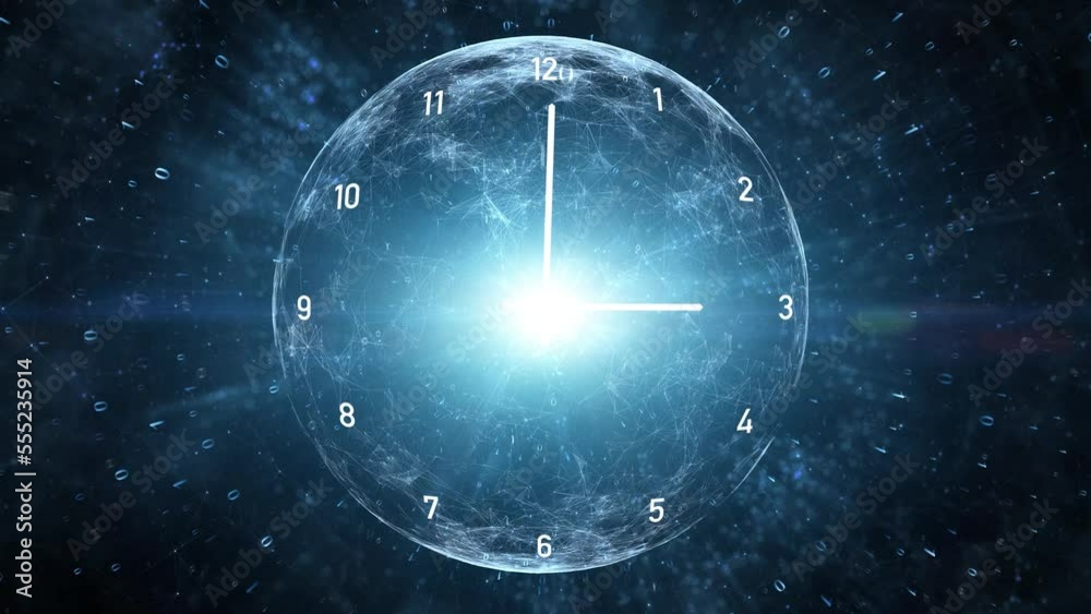 The watermark will not be included on Canvas Print.: Infinity cosmos time looping clock on artistic glowing digital background with sphere and binary cod