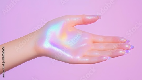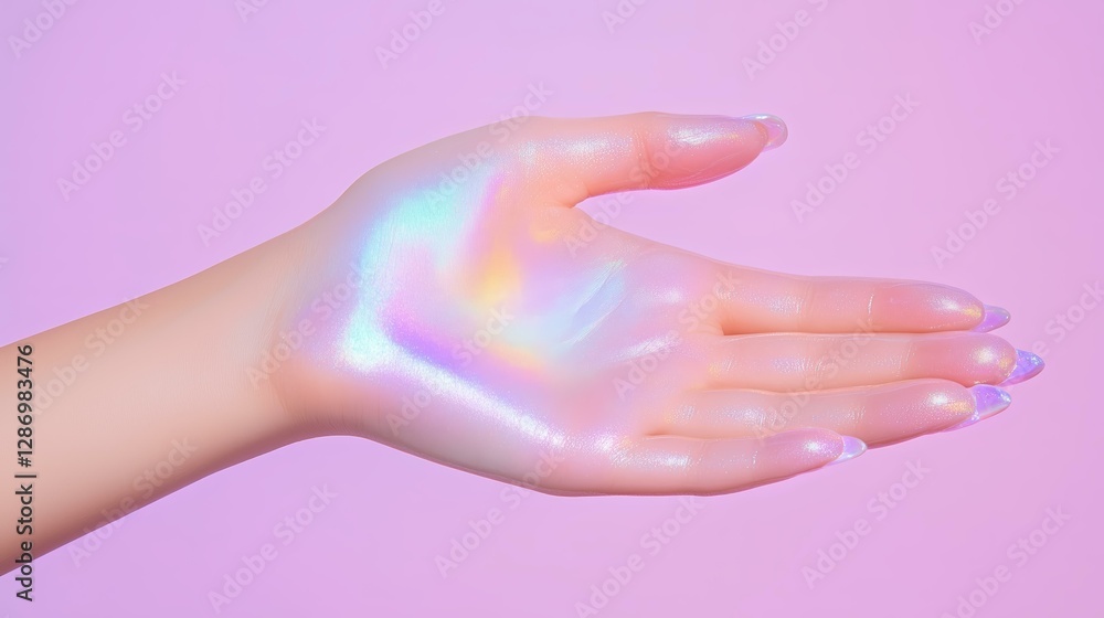 The watermark will not be included on Canvas Print.: Iridescent glow on hand with holographic effect against pink background