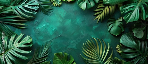 The watermark will not be included on Canvas Print.: Isolated tropical leaves on green backdrop offer a vibrant creative idea from a top view with ample