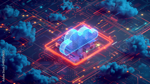 The watermark will not be included on Canvas Print.: Isometric cloud storage for downloading, representing a digital service or application facilitating
