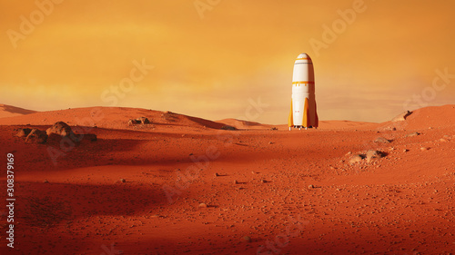 The watermark will not be included on Canvas Print.: Landscape on planet mars, rocket landing on the red planet
