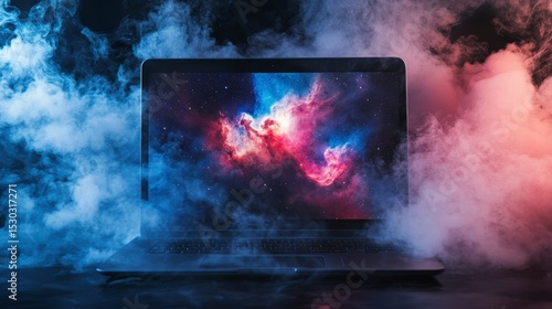The watermark will not be included on Canvas Print.: Laptop displaying a nebula image, enveloped in blue and red smoke -
