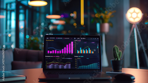 The watermark will not be included on Canvas Print.: Laptop screen displaying a colorful data dashboard with growth metrics, charts, and a line graph sho