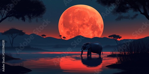 The watermark will not be included on Canvas Print.: Large elephant is walking across a river in front of a red moon