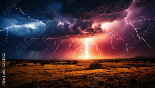 The watermark will not be included on Canvas Print.: Lightning from storm clouds in the field at night, part 8