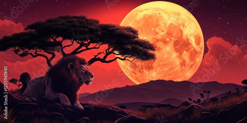 The watermark will not be included on Canvas Print.: Lion is laying in the grass next to a large red moon