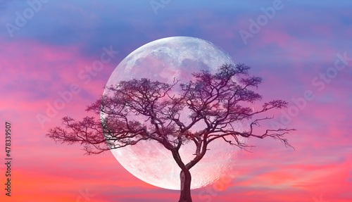 The watermark will not be included on Canvas Print.: Lone acasia tree with full moon rising in the background "elements of this image furnished by nasa"