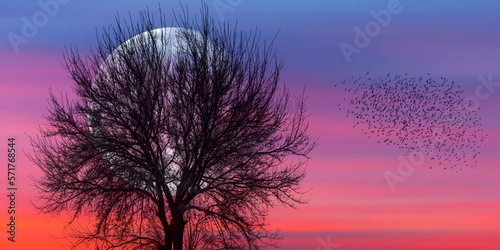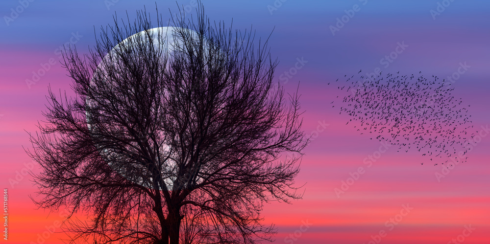 Canvas Prints lone dead tree with super full blue moon, amazing clouds in the background