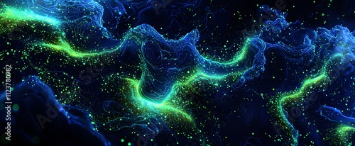 The watermark will not be included on Canvas Print.: Luminous green energy stream with particle trails on a detailed dark abstract background