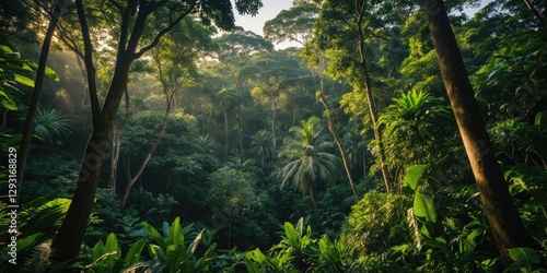 Canvas Print : Lush green tropical rainforest with sunlight filtering through dense foliage creating a serene and v