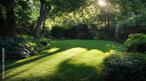 The watermark will not be included on Canvas Print.: Lush green yard illuminated by sunlight filtering through the foliage of surrounding trees
