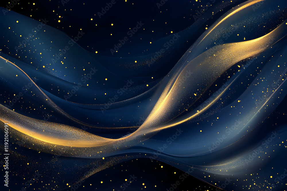 The watermark will not be included on Canvas Print.: Luxury abstract background of golden particles swirling dynamically over a navy blue gradient