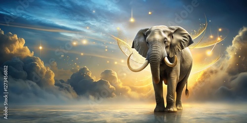 The watermark will not be included on Canvas Print.: Majestic elephant amidst celestial wonders, illuminated by golden rays of light and sparkling stardu