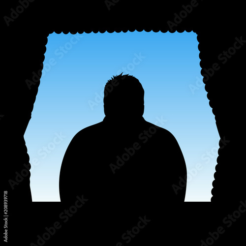 The watermark will not be included on Canvas Print.: Man looks out window - vector illustration with isolated silhouettes of man and wavy curtains - blue p