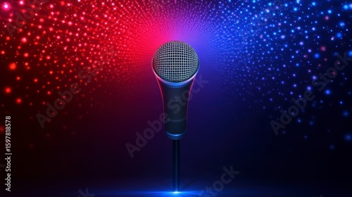 The watermark will not be included on Canvas Print.: Microphone on stage with colorful lights -