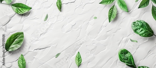 The watermark will not be included on Canvas Print.: Minimal style copy space image with fresh green leaves on a white paper surface