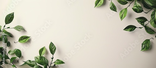 The watermark will not be included on Canvas Print.: Minimal style copy space image with green leaves on a white paper surface
