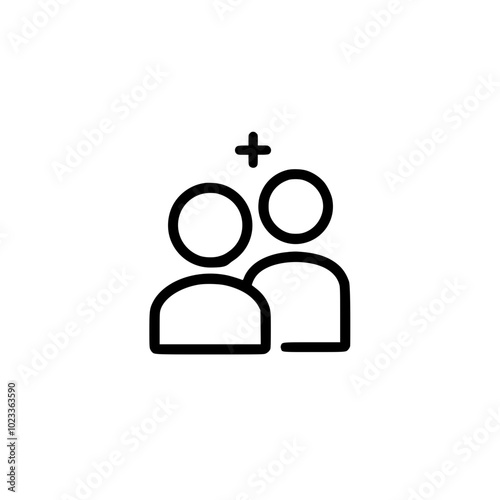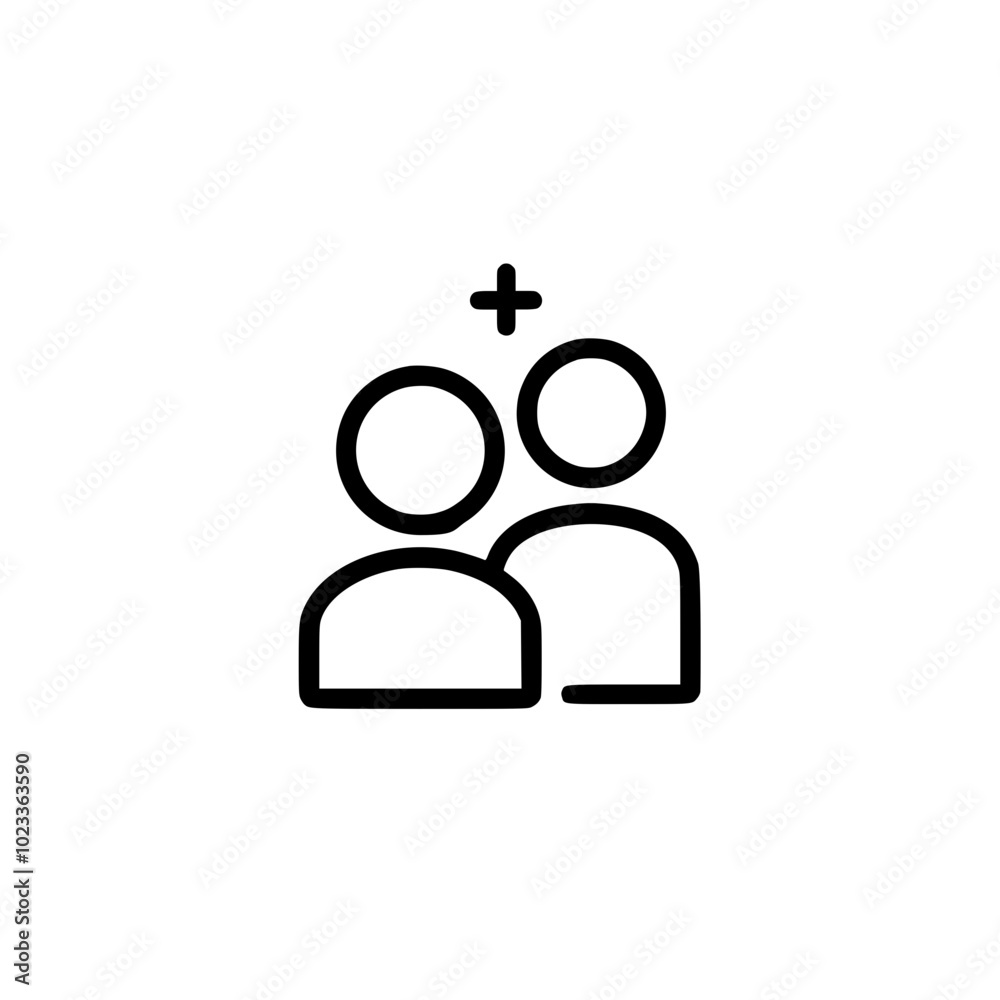 The watermark will not be included on Canvas Print.: Minimalist icon depicting the concept of adding a new user, featuring two outlined figures and a plu