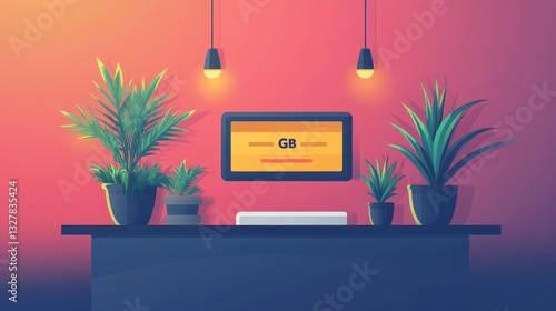 The watermark will not be included on Canvas Print.: Modern desk setup with computer monitor, indoor plants, and hanging lights in a stylish minimal mode