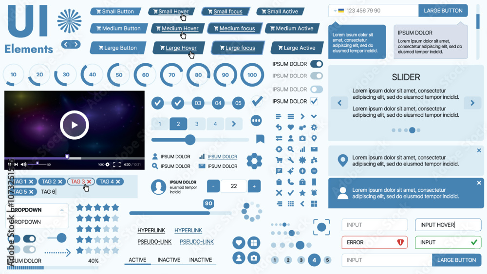 The watermark will not be included on Canvas Print.: Modern ui kit featuring a collection of essential buttons, icons, and navigation elements for websit