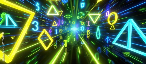 Canvas Prints neon shapes and numbers fly through a futuristic tunnel.