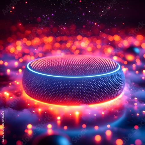 The watermark will not be included on Canvas Print.: Neon speaker surrounded by glowing spheres and pulsing waves of light