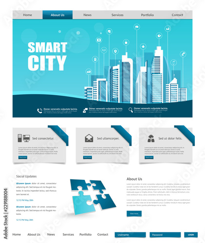 Canvas Print : One page website template with flat illustration of smart city header design