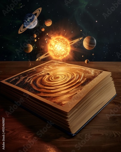 The watermark will not be included on Canvas Print.: Open book with solar system