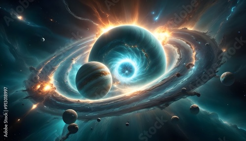 The watermark will not be included on Canvas Print.: Outer space with alien planets and explosion