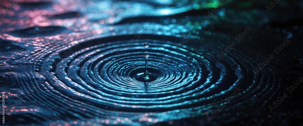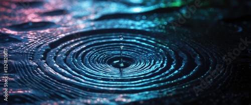 The watermark will not be included on Canvas Print.: Panorama of water ripples created by a drop in darkness - abstract circular water drop ripple - backgr