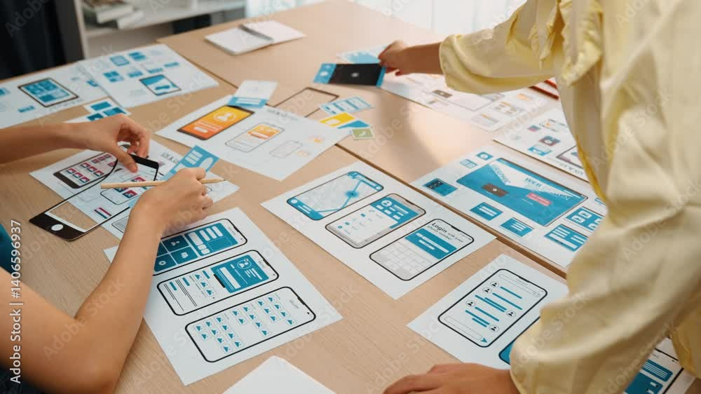 Canvas Print : Panorama video of startup company employee planning on user interface prototype for mobile applicati