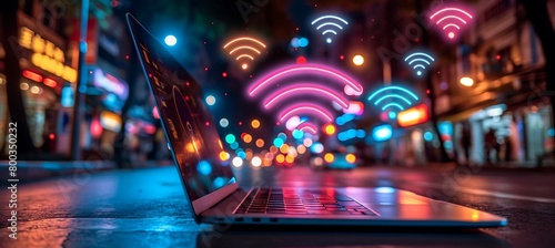 The watermark will not be included on Canvas Print.: Panoramic banner highlighting a laptop with a variety of icons on display
