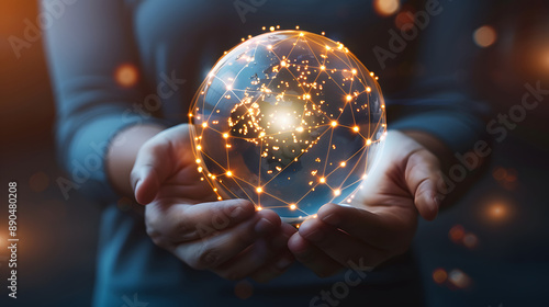 Canvas Prints person holding glowing globe earth on hands, interconnected global connectivity data network technol