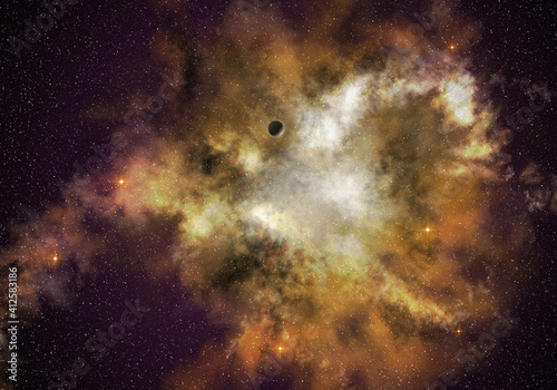 The watermark will not be included on Canvas Print.: Planet orbiting a distant glowing nebula
